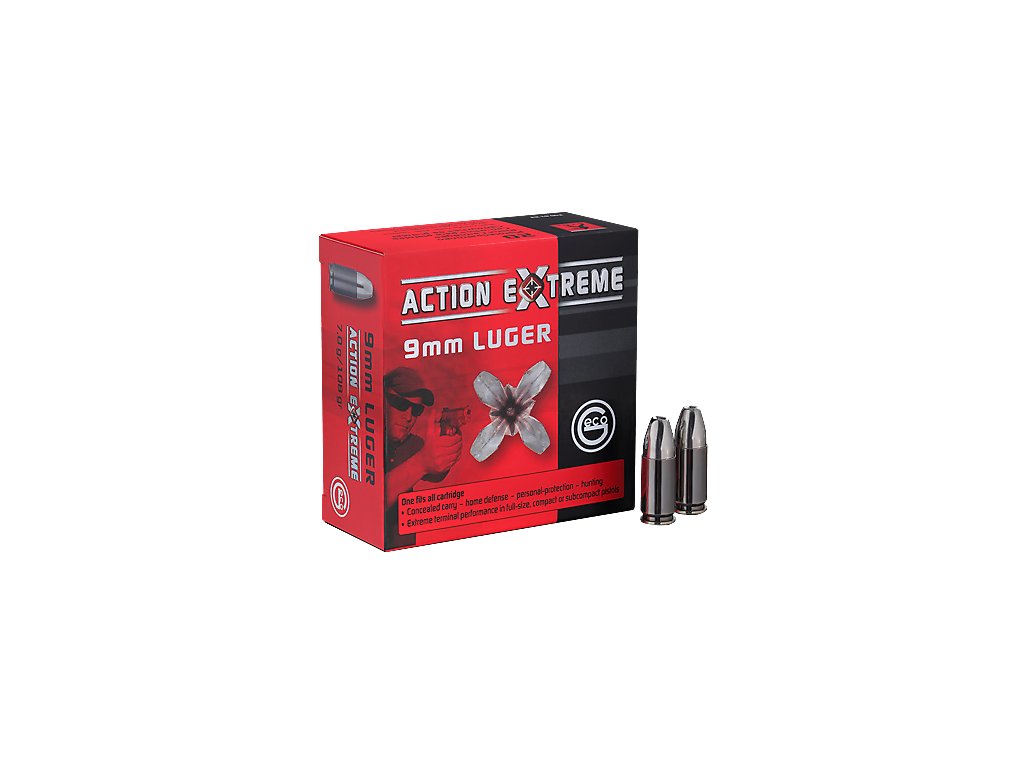 GECO ACTION EXTREME splňuje požadavky a standardy, očekávané od moderní munice pro lov a sebeobranu. Projektil ráže 9 mm se kontrolovaně houbovitě deformuje a má velice vysokou průraznou sílu. Energie se v cíli plně přenáší a stavěcí účinek je vynikající. PATRONA ACTION EXTREME je všestranně použitelná. Může se používat v karabinách pistolového kalibru, ale také ve Full-Size a dokonce v subkompaktních pistolích.