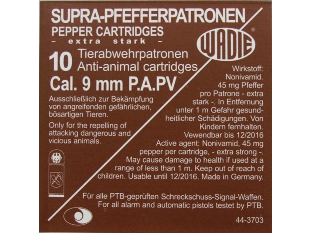 PV pepřový plynový náboj ráže 9 mm. Obsah: Nonivamid (technický pepř) - 45 mg v jedné nábojce. Baleno po 10 kusech. Určeno pro plynové pistole cal. 9 mm.