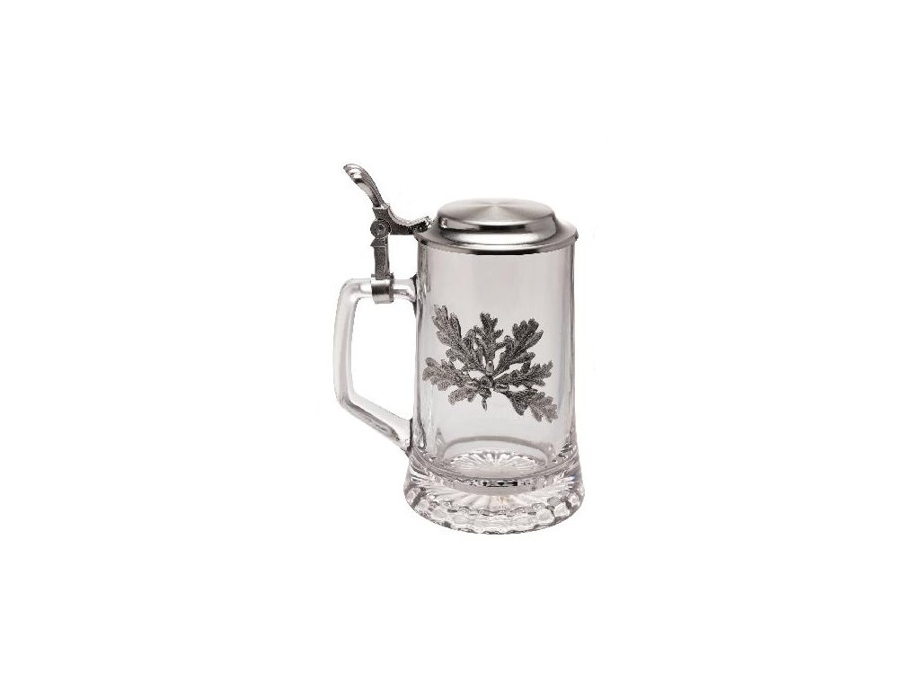 Skleněný korbel s masivním dnem, materiál - litý olovnatý křišťál, obsah 0,5l, zdobení cínovou plastikou s loveckým motivem, ploché cínové víko.