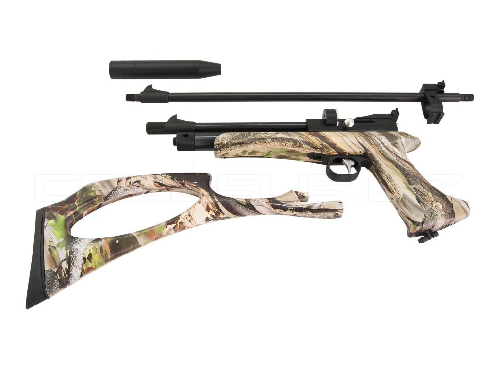 Edice camo má proti standardnímu modelu pažbu i rukojeť v camo provedení. Vypadá velmi dobře, co říkáte? Po veleúspěsném modelu CP1, který je stále v nabídce, přichází další verze s označením CP2. Hlavním rozdílem je použití polymerové rukojeti pro dodržené celočerného taktického designu a hlavně možnost rozšíření na pušku. Součástí pistole je konverzní set, který Vám z pistole vytvoří CO2 pušku. V balení najdete jak prodlouženou hlaveň, tak přídavnou pažbu a dokonce i kompenzátor hluku. Dostanete tedy dvě zbraně za cenu jedné! Vzduchová pistole - puška SPA Artemis CP2 je vhodná pro sportovní střelbu na terč poháněná plynem CO2 dodávaným z 12g bombičky CO2, která se vkládá do pouzdra pod hlavní. Přesná střelba bez zpětného rázu až 40 ran vzhledem k vyššímu výkonu. Princip systému CO2: Bombička se vloží do zbraně a mechanickým uzavřením se napíchne na trn. Po stisknutí spouště narazí kohout na úderník ventilu a ventil se otevře. Tudy začíná proudit plynný CO2 z bombičky, který vyžene střelu z hlavně. V základu jednoranná zbraň má možnost vyjmout jednoranný podavač a nahradit ho zásobníkem v případě kalibru 4,5mm na 9ks střeliva typu diabolo. Zásobník je součástí balení a je možné ho také dokoupit navíc. Přebíjení modelu SPA Artemis CP2 se provádí páčkou umístěnou z levé strany proto, aby nebylo nutné pro praváka během střelby přehmatávat kvůli přebíjení. Páčka přebíjení je zároveň jezdcem - podavačem střeliva, který diabolku vkládá přímo do hlavně. Výstřel tedy jde přímo z hlavně, nikoli ze zásobníku, díky tomu je střelba výrazně přesnější. Střelba levou rukou je možná také, jen trošku méně komfortní. S mířením na cíl pomůžou klasická černá mířidla, hledí stavitelné výškově i stranově a muška pevná. Pokud by Vám klasická mířidla nevyhovovala, můžete na pistoli díky drážkám 11mm namontovat zaměřovací doplněk, kolimátor či optiku. Nezapomněli zbraň vybavit manuální pojistkou proti náhodnému výstřelu, která je umístěná v horní části spouště. Ovládá se zamáčknutím z pravé a levé strany. Vzhledem k tomu, že je SPA Artemis CP2 2v1 jsou její parametry složitější: V případě pistole: drážkovaná hlaveň o délce 208 mm, celková délka zbraně 306 mm a hmotnost 913 g. V případě konverze na pušku: drážkovaná hlaveň o délce 450 mm, celková délka zbraně 868 mm a hmotnost 1522 g.